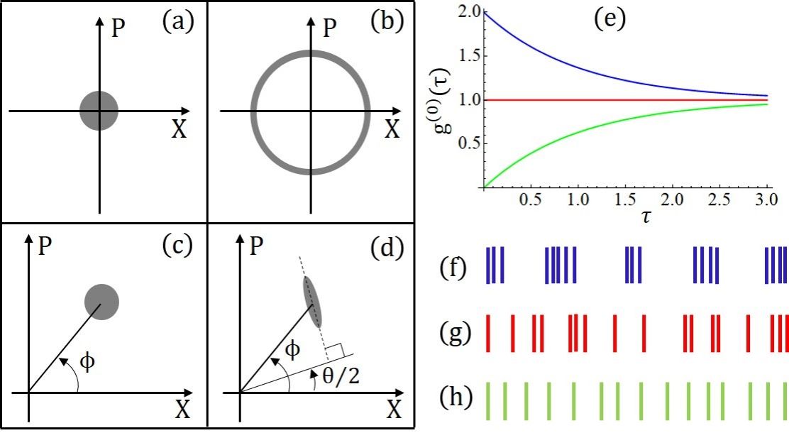 图 2 相空间中动量-位置涨落图对应(a)真空态,(b)Fock态,(c)相干态和(d)压缩态。(e)不同的态(蓝色为经典态,红色为相干态,绿色为量子态)所对应的二阶关联函数。 不同的态对应的声子计数情况:(f)聚束(经典态),(g)随机(相干态)和(h)反聚束(量子态)。